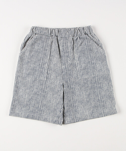 \ジャージー素材で 着心地楽ちん♪/ 《デザイン》 すっきりとしたヒッコリー柄を総柄でプリントしたハーフパンツです。 全体をオートミールやネイビーのすっきりとしたカラーでまとめて、 おしゃれで大人っぽい印象に仕上げています。 ジャージー素材なので穿き心地良く、動きやすさがあります。 お子様でも着脱しやすいオールゴム仕様で、 内側にゴム調整口があります。 単調になりがちな春夏のコーディネートのアクセントになるカジュアルな1枚です。 男の子女の子問わず着られます。 ベビー(品番:23-55PK31-205)にも展開していますので、お揃いが楽しめます。 《セットアップ》 品番:98-61TK45-205 Tシャツ:ネイビー ボトムス:キナリ Tシャツ:キナリ ボトムス:ネイビー こちらのカラーの組み合わせでセットアップになります。 《素材》 柔らかく、程良い厚さのジャージー素材にヒッコリー柄をプリントしています。 表側は天竺に見えるのに対し、裏側にはパイル糸が見えることが特長の素材で、] 裏毛にも似ていますが、裏毛よりもループが浮いていなく、 厚みが抑えられたすっきりとした素材です。 ご自宅で洗濯機洗い可能です。 《ネイビー着用》 model:H112cm 着用サイズ:120cm ※画像の商品はサンプルとなりますので実際の商品と仕様、加工、サイズが若干異なる場合がございます。 ※こちらの商品はFIVE FOXes独自の採寸方法となっています。 本サイトのサイズガイドと採寸方法が異なる場合がありますのでご了承ください。