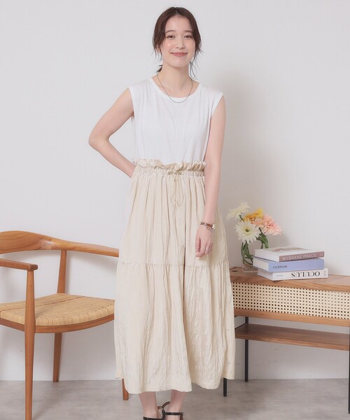 【デザイン】 ほんのりスポーティームードなワンピース。 異素材ドッキングデザインで簡単にコーディネートがサマ見え。 ウエストのドローストリングデザインがアクセントのスポーティーなワンピース。 スカート部分はサテンワッシャー生地を使用した光沢感のある表情が特徴。 適度なハリ感と軽さのあるポリエステル・ナイロン素材です。 トップスはカットソー素材ですっきりとしたコンパクトめなシルエット。 切替位置を高めに設定する事で自然なスタイルアップ効果も期待できるデザイン。 一枚で簡単にコーディネートが決まる時短アイテムです。 【素材】 身頃はポリエステル・コットンの天竺カットソー素材。 スカート部分は軽さと適度なハリ感が特徴のサテンワッシャー素材。 【仕様】 ・ポケット数:横×2 ・ウエスト総ゴム ・スカート部分のみ裏地あり ※こちらの商品はやや透け感があります。 ※照明の関係により、実際よりも色味が違って見える場合があります。また、パソコン・スマートフォンなどの環境により、若干製品と画像のカラーが異なる場合もございます。 モデル情報:身長166cm B80 W59 H85 着用サイズ:00(フリーサイズ) 店舗へのお問い合わせ商品番号:P93-52030 ●製品寸法: 00(フリーサイズ):着丈119cm B78cm 肩幅40cm W~70cm H108cm 備考: