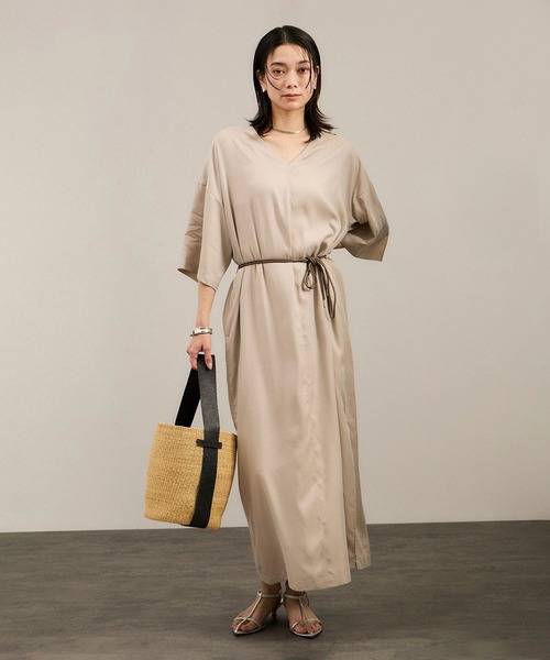 付属のベルトでスタイルアップもできる、大人のリラクシーワンピース■デザイン/シルエット 暑い時期にも程よいシルキータッチで、肌離れの良いゆとりあるシルエットが魅力のワンピース。 気になる腰やヒップ周り、二の腕も体型カバーしつつ、首元のVネックがすっきりと見せてくれます。 サイドのスリットが歩くたびに揺れる美しいドレープを表現。 付属のロープベルトで、お好みにあわせてウエストマークするとスタイルアップにも◎ ■素材 シルキーなキュプラにリサイクルポリエステルを組み合わせた 程よい光沢感と落ち感のあるツイル素材を使用しています。 弱めのフィブリル加工を施しカジュアルすぎないヴィンテージ感を表現。 ご自宅で手洗い可能なのも嬉しいポイント。 ■コーディネート 1枚で着るのはもちろん、デニムとレイヤードスタイルも素敵です。 ■キュプラツイルシリーズ一覧 ・商品番号:SHJ35240 商品名:キュプラツイルジレブラウス ・商品番号:SHC35240 商品名:キュプラツイルバックフレアースカート ・商品番号:SHE35230 商品名:キュプラツイルVネックワンピース ■モデル身長:166cm 着用サイズ:F ーーーーーーーーーー 裏地:なし 光沢感:ややあり 透け感:なし ポケット:あり 伸縮性:なし 生地の厚さ:薄手 ーーーーーーーーーー