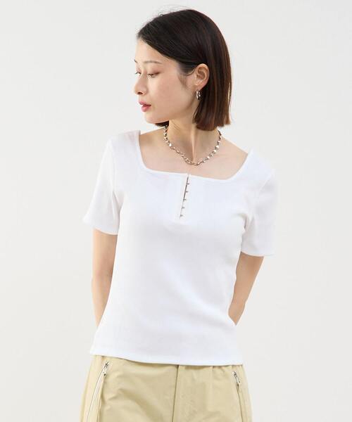 前後2WAYで着用できるスクエアネックカットソー。 程よい厚みで透けも気にならず、 女性らしいラインのスクエアネックで1枚で着てもお洒落に見えるアイテム。 センターバックに付いたフック&アイテープと 肩部分にはスナップがついており、 ずれないようになっているのもポイント。