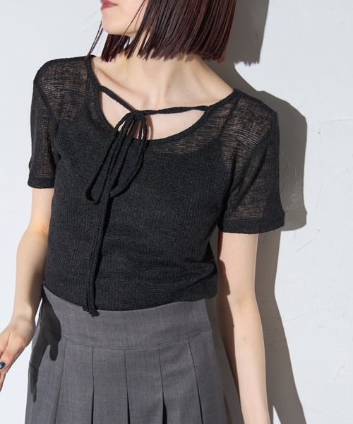 柔らかい素材感とチョーカーでトレンド感・柔らかい生地感で抜け感があるフェミニンなトップス ・アンニュイな印象です ・トレンドのチョーカーは服についているので首に巻いても前でリボンにするのも◎ ・巻きスカートと相性◎ 夏服/春服/晩夏服/韓国/リボン/レイヤードコーデ/バレエコア ___________________ 透け感:ややあり 裏地:なし 生地の薄さ:やや薄め 伸縮性:あり 光沢感:なし ___________________ ◆《お気に入り登録》がオススメ◆ ・「商品のお気に入り登録」で再入荷通知や、ラストの通知、セール通知も受け取ることが出来ます。 ・「ブランドのお気に入り登録」で新商品や再入荷など、お得な情報を受け取ることが出来ます。 ※撮影時のライティング、ご覧になっているモニター ・PC環境により、実際の商品と色味が異なって見える場合がございます。予めご了承をお願い致します。 ※モデル着用画像は実際の色と多少異なる場合がございますのでトルソー画像をご確認ください。 ※他のキャンペーンにより、期間中に価格が変動する場合があります。 ※セールは予告なく終了させていただく場合もあります。
