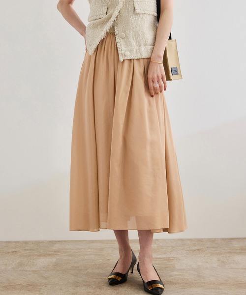 ゴムベルトのような仕様はウエスト周りがソフトな当たりでノンストレス、ショート丈トップスでウエストからのギャザーをちらっと見せる着こなしが新鮮なフレアースカート【デザイン・シルエット】 分量をたっぷりとったギャザースカートで、軽さとドレープ感といった素材の特性が最大限に活かされたアイテムとなっています。シルクコットンの落ち感と軽さが華やかな印象を与えます。 【おすすめのスタイリング】 リネントップスや、シアートップスなど軽めのトップや、リネンのツイードとのコーディネートもおすすめです。 【素材】 シルクの光沢感、清涼感が有り、コットンのナチュラル感を備え上質な風合いに仕上がっています。 ---------------------------- 透け感:ややあり 裏地:あり 伸縮性:なし 光沢感:あり 生地の厚さ:薄手 ポケット:なし 開き方:ファスナー ---------------------------- 【モデル情報】 モデル身長:171cm 着用サイズ:F 【コットンシルク シリーズ】 同素材でデザイン違いの コットンシルクワンピース(品番:GGE25440) コットンシルクブラウス(品番: GGH25440) コットンシルクスカート(品番:GGC25440) がございます。 ※画像の商品はサンプルです。実際の商品と仕様、加工、サイズが異なる場合がございます。 ※撮影場所やライティング、お使いのモニター環境によって色の見え方が異なる場合がございます。 ※商品のカラーは画像の色味をご参照ください。動画は仕様説明のため、色味が実物と異なる場合がございます。