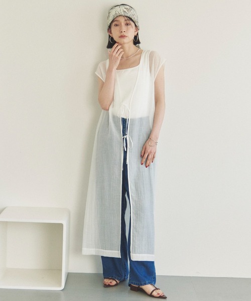レイヤードが楽しめるリラクシーなジレワンピース【point】・ジレとしてシンプルなスタイリングにさらっとプラス・バックデザインにリボンを持ってきてノースリーブのワンピースとしても着られます・ゆったりしたシルエットで締め付け感もなくらくちん◎・シワが気になりにくいので旅行にもオススメ・サイドにスリットあり【fabric】・表面感のある楊柳素材で、軽くシワが気になりにくい素材・ご自宅でのお手入れ可能透け感:あり裏地:なし伸縮性:若干あり光沢感:なし生地の厚さ:薄手**********************【スタッフ着用コメント】身長:158cm/体型:普通/普段サイズ:M/着用サイズ:FREEサイズ感:全体的にゆとりがあります。丈は膝下15cm位の長さです。素材感:楊柳素材でシワにもなりにくく、サラッとした生地感で柔らかいシアー素材です。着心地:インナーをロゴTにしたり、シンプルなコーデに羽織るだけでこなれ感がでます。前後2wayなのでリボンを後ろにして着てみました◎後ろをリボンにしてもかわいい。フレンチスリーブなのも嬉しいポイント◎**********************【注意事項】・画像の商品はサンプルです。実際の商品と仕様、加工が若干異なる場合があります。・サイズ表記はあくまで目安となります。・取り扱いについては、商品についている品質表示でご確認ください。・照明の関係により、実際より明るく見える場合がございます。またパソコンなどの環境により、製品と画像のカラーが若干異なる場合がございますので、予めご了承くださいませ。■お気に入り登録がオススメです!■《商品のお気に入り登録》カラー・サイズ選択の横の「♡」をクリックで簡単に登録できます完売カラーの再入荷や在庫が1点になったとき、セールになったときに通知をお届けします《ブランドのお気に入り登録》ページ上部のブランド名の「♡ お気に入りブランドに追加」をクリックで簡単に登録できます新商品の情報やイベントなどお得な情報をいち早くお届けします是非、ご登録お願いします♪
