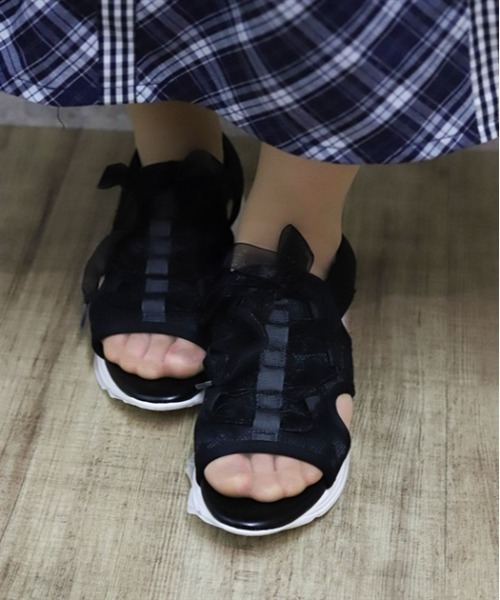 axes femme 2025 summer collection 【商品紹介】 軽くて歩きやすい、リボンデザインがポイントのスニーカーサンダルです。 【デザイン】 靴ひもには軽やかなオーガンジーリボンを使用し、アッパーに繊細なレース生地を重ねています。 カジュアルながらも、さりげないフェミニンさをプラスしたデザインです。 足首部分はサイドゴムになっており、程よいホールド感&脱ぎ履きが楽ちんです♪ 【コーディネート】 い時期には素足で涼しくカジュアルに◎ 靴下を合わせてキレイめなスタイルに仕上げるのもおすすめです。 靴下はシンプルなものや、素材・色味を揃えるとまとまりが出て◎ レースやシアー素材を合わせると軽やかな印象になります。 ▽ axes femme * アクシーズファム 【Concept】 axes femmeのお洋服であなたのライフスタイルに ほんの少しだけ彩る花が咲きますように。 ブランドを通して、彩る花たちが、 人と人、お客様や作り手たちの想いが世界中に繋がっていきますように。 ベル・エポック(フランスの古き良き時代)にパリジェンヌたちが愛したファッションや文化にルーツをおき、 独自のフェミニンスタイルを楽しむブランド ********************** .。.: お気に入り登録のおすすめ :.。. ∇気になるアイテムを登録∇ ハートをクリックしてお気に入りに登録すると 完売カラーの再入荷やラスト1点の通知、セールの通知を受けとることができます。 ∇ブランドを登録∇ 新商品や再入荷、セール通知など、いち早くブランドの情報を受けとることができます。 是非ご利用頂き、お買い物をお楽しみ下さい。 .。.: 商品について :.。. ・サイト上のカラー名と、お届け商品に記載されているカラー名が異なる場合がございます。 ・商品の色味は、撮影場所や光のあたり具合、お客様のお使いのPCのモニター環境などにより色味が違って見える場合がございます。 予めご了承の上ご注文下さい。 .。.: 返品・キャンセルについて :.。. ・着用、洗濯後の返品は致かねます。 ・商品到着後、着用前に商品を確認して頂きますようお願い致します。