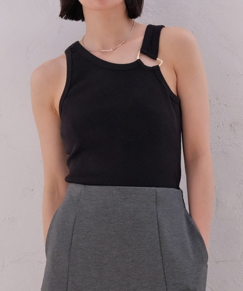 シンプルなデザインに引き立つメタルリングがタンクトップをモードにブラッシュアップ エッジの効いたアクセントをプラスするタンクトップ。 メタルパーツがさり気ないアクセントになり、シンプルなボトムスとの組み合わせも決まる一枚です。 程よく厚みのある生地を使用し、インナーが透けにくいのも嬉しいポイント。 タイトすぎない絶妙なフィット感は、モードにもカジュアルにも着こなせる万能アイテムです。 通学はもちろん、テーマパークなどのお出かけコーデや、カジュアルなスニーカー合わせのスタイリングもおすすめ。 --------------------------------- 透け感:ホワイトのみややあり 裏地:なし 伸縮性:あり 光沢感:なし 生地の厚さ:普通--------------------------------- ▼お取り扱い上のご注意 ※お手入れの際は商品の縫込みネーム・アテンションを必ずご確認ください。 家庭洗濯〇(40℃限度。手洗いのみ) 漂白× タンブル乾燥× 日陰での平干し アイロン〇(低温110℃まで。スチームアイロン×) ドライクリーニング〇(弱い処理。石油系溶剤) ウェットクリーニング〇(非常に弱い処理) ・洗濯時、ネットを使用して下さい。 ・形をととのえてから干して下さい。 ・色物と白物一緒に洗濯しないで下さい。 ・染色過程や素材の特性上、特有のにおいが残る場合ございます。気になる場合は陰干しか、お洗濯されることでにおいは減少いたします。 メッキ製品や貴金属のアクセサリーは大変デリケートな為、ご使用にあたりましては、下記の点にご注意下さい。 ・メッキ商品(特に銀メッキ)は変色してしまいがちです。 こまめなお手入れで防止して下さい。 長期放置やスプレー香料などとの同時使用は特にお避け下さい。 ・メッキ製品は、アレルギー体質の方や体調が低下している方など、かぶれることがあります。 肌に異常を感じた時はご使用をお止めいただき専門医にご相談下さい。 ・アクセサリーをつけたままでの入浴や水仕事は厳禁です。 ・アクセサリーは、こわれやすいものです。 取り扱いに注意していただき、大切にご使用いただける様お願い申し上げます。 濃色の製品は摩擦(特に湿った状態での摩擦)や、汗や雨などで濡れた時は他の衣料や下着(特に白物)に色移りする場合がありますので、十分ご注意下さい。 お洗濯/クリーニングの際は、色落ちすることがありますので、単品洗いをおすすめします。 また、他の淡色物に色移りすることがありますので、すみやかに処理(脱水・乾燥)するようお願いいたします。 以上の点を十分ご留意の上、お取扱い下さい。