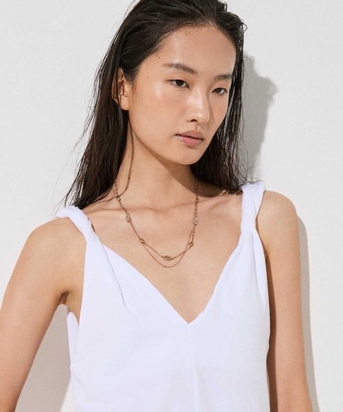 異なる表情の華奢なチェーンを組み合わせた、繊細な表情が魅力のネックレス。小さなクリスタルや歪な形のモチーフをバランス良く飾り、表情豊かに仕上げました。 コーディネートに取り入れやすく、どんなトップスにも合わせやすい長さなのもポイント。 重ね着けしているようなデザインな為、この一つでワンランク上の上質な装いをお楽しみいただけます。