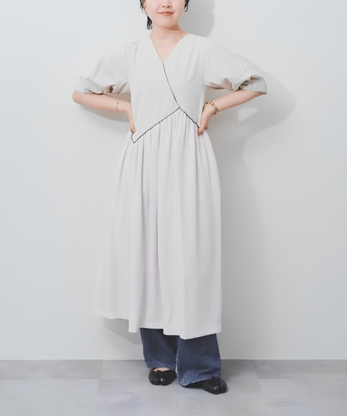 【Material】 程よい厚みのダブルクロス素材を使用したフレアワンピース。 シワになりにくく、落ち感のあるきれいめな表面感が特徴で、シーズンレスで着用可能な万能素材です。 【Design】 配色パイピングがアクセントになったデザインワンピース。 パネル切替を施すことで立体的なフレアシルエットを演出し、シンプルながらも一枚で映える主役アイテムに仕上げました。 【Size】 ゆとりのあるシルエットながら、ウエストを程よくシェイプしたメリハリのあるデザイン。体のラインを美しく見せ、スタイルアップ効果も期待できる一着です。 【Styling point】 1枚でさらっと着るだけで春らしい軽やかなスタイルに。 カーディガンやライトジャケットを羽織れば季節の変わり目にも活躍します。足元はパンプスやサンダルで抜け感を出すのがおすすめです。 【商品特性】 透け感:なし 裏地:あり 伸縮性:なし 光沢感:あり 生地の厚さ:普通 ▼お気に入り登録 アイテムをお気に入り登録・・・再入荷やラスト1点、セールなどの情報をお知らせします! ブランドをお気に入り登録・・・新作や販売開始のお知らせを受け取れます! ※撮影時の光の加減やご使用の端末により、実際の色味と異なる場合がございます。あらかじめご了承くださいませ。