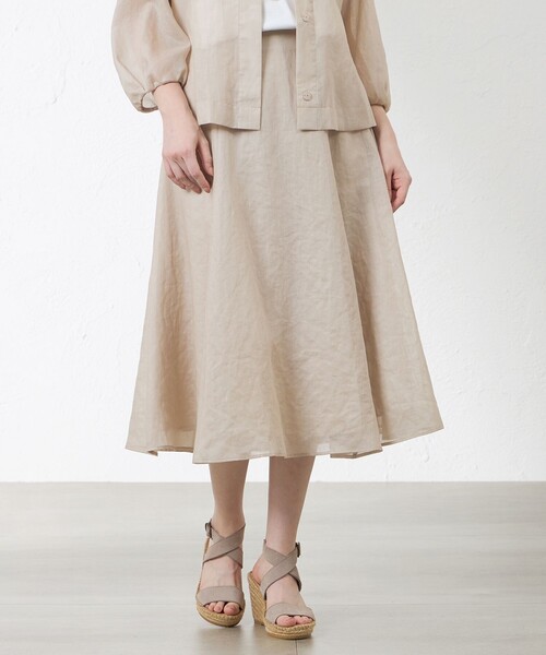 ポリエステルオーガンジーフリルスカート【デザイン】透け感のあるポリエステルオーガンジーでフレアのシルエットがきれいなスカートを作りました。腰回りはすっきり、裾に向かって広がるフレアは上品さとエレガントな印象を演出します。ブルゾンとセットアップのスタイリングもおすすめです。【素材】ポリエステル100%のオーガンジーです。適度なハリ感があり、ナチュラルなワッシャー感が夏らしく、キレイ目カジュアルな着こなしが叶う素材感です。