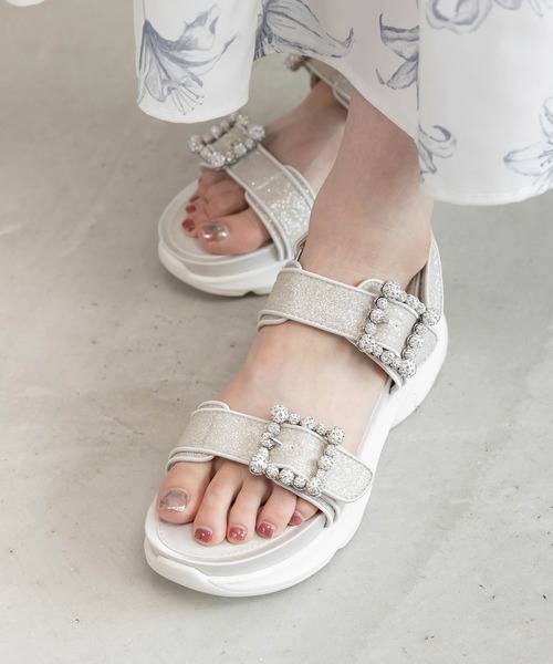 ◆2025SS新商品◆ 大胆なビジューバックルが目を惹くグリッタースポーツサンダル。 きらきらと輝くビジューやグリッターが、夏の足元をぱっと華やかに彩ります。 POINT ・存在感のあるビジューを贅沢に施したバックルで華やかに ・小粒ラメのグリッター生地を採用し、サテン生地とのコンビネーションで上品さをプラス ・デニムなどのシンプルなスタイルから上品フェミニンまで様々なスタイルに合わせやすいデザイン ・スタイルアップが叶うボリュームソール 機能性 ・オリジナルのフットベッド 心地よい弾力性を追求 足裏でクッション性を発揮しながら衝撃を吸収し歩行をサポート ・全てのベルトが調整可能 ※デリケートな素材を使用しております。摩擦や水濡れ等によりラメが脱落する場合がございますので ご注意ください。 スタッフの着用コメント ----------------------------- スタッフA [普段のサイズ:Sサイズ/22.5cm] 足長:22.5cm / 足幅:普通(E) / 甲高:普通 サイズ選びのポイント:ゆったりめを選びます 【試着サイズ】Sサイズ/素足で着用 【サイズ感】Sサイズでぴったりでした。 【着用コメント】クッションがふかふかで履き心地がいいです。 ----------------------------- スタッフZ [普段のサイズ:Mサイズ/23.5cm] 足長:23.5cm / 足幅:普通(E) / 甲高:高め サイズ選びのポイント:ゆったりめを選びます 【試着サイズ】Mサイズ/素足で着用 【サイズ感】Mサイズでぴったりでした。 【着用コメント】軽くて快適です。 ----------------------------- スタッフM [普段のサイズ:Lサイズ/24.0cm] 足長:24cm / 足幅:狭め(C) / 甲高:高め サイズ選びのポイント:ゆったりめを選びます 【試着サイズ】Lサイズ/素足で着用 【サイズ感】Lサイズでぴったりでした。 【着用コメント】後ろベルトで調節できるので足にフィットします。 ----------------------------- スタッフI [普段のサイズ:LLサイズ/25cm] 足長:25cm / 足幅:狭め(C) / 甲高:高め サイズ選びのポイント:甲が高いのでゆったりめを選びます 【試着サイズ】LLサイズ/素足で着用 【サイズ感】LLサイズでぴったりでした。 【着用コメント】前が少し上がってるので歩きやすいです。 -----------------------------