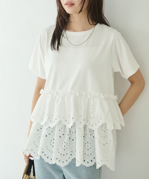 昨年ご好評いただいたクラフト刺繍プルオーバーが再入荷。新色「ネイビー」も加わりました! ■デザイン きれいめな生地感のTシャツにナチュラルな風合いの刺繡レースをドッキングしたデザイン。 ふんわりと揺れる2段になったティアードで立体感のあるシルエットに。バスト下から切替ているので、スタイルアップ効果も期待できます。 切替部分のフリルが、甘さをほどよくプラス。大人の女性にも取り入れやすいバランスに仕上げました。 ■素材 Tシャツ:表面が滑らかで、ごわつきのない肌当たりの良い素材。 レース:刺繡を施した程よいハリ感のある素材。 ■コーディネート 程よいボリューム感がありながら、広がりすぎない絶妙なシルエットなので、 タイトスカートで女性らしく、ワイドパンツでリラックス感のある着こなしもおすすめです。 一枚で春夏らしい華やかなスタイリングが完成します。 ・刺繍/刺しゅう ・お手入れ方法:洗濯機可 ・マルチサイズ/大きいサイズ対応(M/LL/3L/4L/5L) --------------------------------------- 透け感:なし 裏地:なし 伸縮性:あり 生地の厚さ:普通 --------------------------------------- 【お買いものをよりお楽しみいただく為に♪】 ▼商品のお気に入り登録(ハートマークをクリック) お気に入りアイテムの再入荷やセールの通知も受け取ることができます。 ▼ブランドのお気に入り登録 新商品やクーポン配布などのお得な情報を受け取ることができます。 ■商品注意事項■ ※商品画像は、光の当たり具合やパソコンなどの閲覧環境により、実際の色味と異なって見える場合がございます。予めご了承ください。 ※末永く愛用頂く為に、アテンションタグ・洗濯ネームを必ずご確認の上、着用又はお取り扱い下さい。 ※生産時期により色味が多少異なる場合がございます。予めご了承ください。