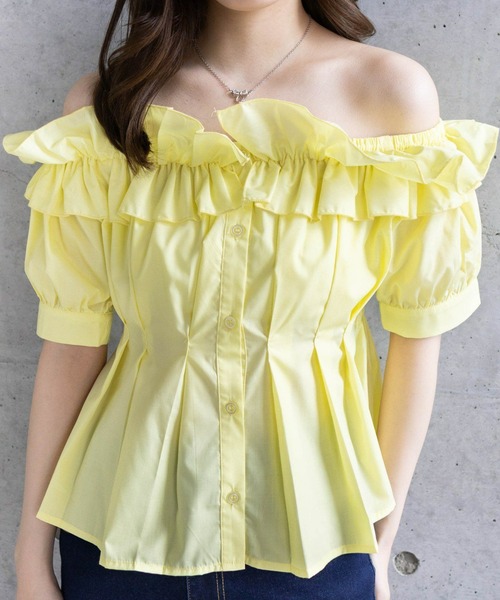 華やかな印象の!フリルオフショルブラウス 【デザイン】 ボリューム感のあるフリルがアクセントになるブラウスです。 オフショル仕様なので、ヘルシーな肌見せが叶います! ウエストの部分で切替が入っているので、スタイルアップ効果も抜群です♪ 【素材感】 着心地の軽いポリエステル素材 伸縮性:なし/ 透け感: オフホワイト、イエローの若干あり/ 裏地:なし 手洗いによる洗濯可 / ドライ・ウェットクリーニング可 【コーディネート】 デニムパンツにサンダル合わせで、夏らしいコーデに仕上がります! デコルテ部分が広く見えるので、ネックレス合わせもオススメです◎ カジュアルダウンした装いが可愛い♡ カーゴパンツやデニムなど、メンズライクなアイテムとのコーデが おすすめです。 【※お取り扱い上のご注意】 1:モニター環境等により実際の商品と多少色味が異なって表示される場合がございます。予めご了承下さい。 2:屋外で撮影された商品は、天候により多少実際のカラーと異なる場合があります。商品のカラーはトルソー(マネキン)の商品画像をご参照ください。 3:濃い色の商品は、お洗濯や摩擦等による移染にご注意ください。 4:末永くご愛用頂く為に、アテンションタグ・洗濯ネームを必ずご確認の上、着用又はお取り扱い下さい。 5:生産時期により、色、サイズ、デザイン、素材の質感が多少が異なる場合がございます。あらかじめ御了承下さいませ。
