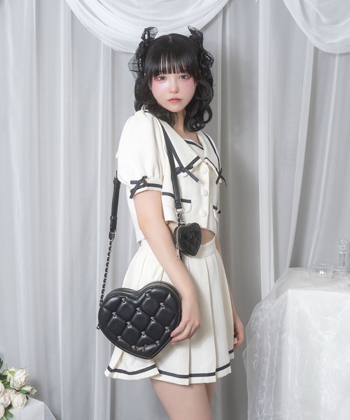 コーディネートのポイントにもなってくれるハート型のショルダーバッグ♡キルティングにシルバーのハートパーツがアクセントを加えてくれます◎ ハートポーチ付きも嬉しいポイントです♪