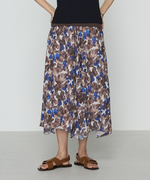 《デザイン》 アートプリント生地をたっぷりと全体に使った八枚接ぎのハンカチーフヘムスカートです。 大胆な大きさの三角形のパーツを組み合わせた八枚接ぎです。 裾に向けて広がるパーツなので、ウエストはすっきりの優雅なシルエットを演出です。 裾はハンカチーフヘムにすることで、動きが出て歩くたびにふんわりとフェミニンです。 軽やかメロウ始末でウエストは楽ちんゴム仕様です。 リラクシーなシルエットなのでジャケットなどと合わせた時に、こなれ感のあるスタイリングが演出できます。 ゴールデンウィークや夏のホリデーシーズンにも活躍する一枚です。 《素材》 KT春の定番、カッセンアートプリントです。 今年は濃淡のあるぼかしモチーフに直線的なストライプを合わせ、きれいめにきちんと感をプラスしたアートプリントです。 トレンドのブラウンカラーに、ロイヤルブルーがアクセントです。 大胆かつ上品な夏ならではのカラーコントラストをお楽しみ下さい。 プリントはインクジェットプリントで、写真の様に細かく美しい柄の表現が可能です。 ベース生地:強撚の割繊糸ならではのシャリっと感が肌離れ良く、清涼感たっぷりです。 ドレープ性がフェミニンな夏の素材です。 お手入れ方法:手洗いOK