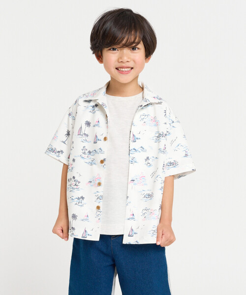 《デザイン》オリジナルのマリンアロハ柄をプリントしたアロハシャツです。上品なマリンアロハ柄は手書きタッチで表現しています。ゆるい線でラフに描くことで、柔らかで親しみやすい柄に仕上げています。柄の中に入ってる文字の意味は『A journey around the blue sea =青い海を巡る旅』ゆったりとしたサイズ感の半袖シャツで、1枚で着ていただくのはもちろん、羽織りとしても活躍してくれます。木の釦を使用することで、ナチュラル感のあるリラックスした雰囲気を演出してくれる1枚で主役級のアイテムです。シンプルなデザインなので男の子女の子問わず着られます。※柄の出方は1枚1枚違いますが製品の味としてお楽しみください。《素材》コットンライクな風合いのポリエステルブロードに上品なマリンアロハ柄をプリントしています。ご自宅で洗濯機洗い可能です。《アイボリー着用》 model:H112cm 着用サイズ:120cm※画像の商品はサンプルとなりますので実際の商品と仕様、加工、サイズが若干異なる場合がございます。※こちらの商品はFIVE FOXes独自の採寸方法となっています。本サイトのサイズガイドと採寸方法が異なる場合がありますのでご了承ください。