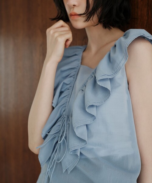 繊細なシフォン素材とフリルのディティールが一枚で映えるブラウス ■デザイン シフォンやフリルのかわいらしいディティールがポイントの夏らしいヘルシーなノースリーブブラウス。 細いリボンをきゅっと結んだフロントのデザイン、細やかにギャザーを入れたボリュームのあるフリルはバックスタイルまで着映えしてくれます。 ■素材 コットン×ポリエステルのしなやかで繊細なシフォン素材。 さらっと軽いタッチと、洗いがかったようなシボ感のある表情がポイント。 ■コーディネート ラフにデニム合わせでヘルシーなスタイリングがおすすめ。 ============================ 裏地:なし 透け感:あり 伸縮:なし 光沢感:なし ケア方法:手洗い可 ============================ < EMMEL REFINES(エメル リファインズ) > Pleasure ~今を楽しみ、変化を楽しむ~ EMMEL REFINESは変化していく時代やトレンドを恐れなく前向きに楽しみ、 今に満足せず常に自分を更新していきたい、 自分らしさを表現したい女性に向けたブランドです。 女性の共感を大切に、時代にフィットした新しいスタイルを提案します。 【注意事項】 ※画像の商品はサンプルです。 ※商品に「取り扱い上の注意書き」、「洗濯表示」がございます場合は、使用前に必ずご確認ください。 ※商品画像は、光の当たり具合やパソコンなどの閲覧環境により、実際の色味と異なって見える場合がございます。あらかじめご了承ください。 ※商品の色味の目安は、商品単体の画像をご参照ください。 お問い合わせの際は、ユナイテッドアローズ カスタマーサービスデスクまで下記の品名/品番をお申し付けください。 品名:EM Vフリル RBN N/SL BL 品番:66161990997