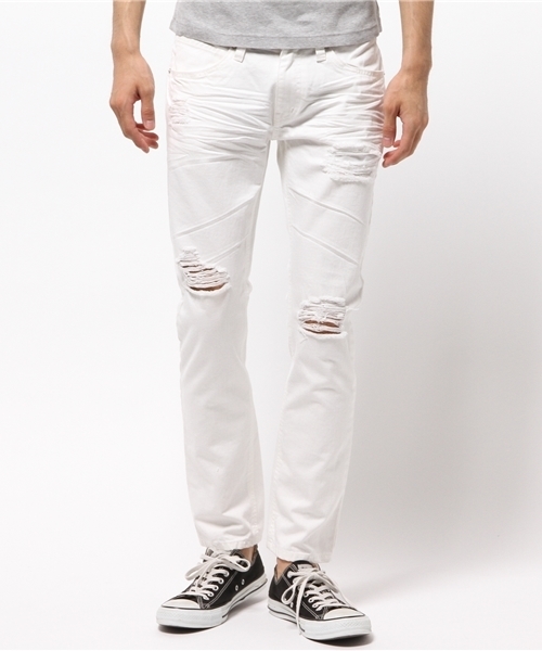 シックなモノトーンパンツにクラッシュ加工を施し、ワイルドにアップデート! シルエットはもちろんダメージ感にもこだわってお作りしました☆ シンプルなトップスをさらりと合わせるだけでもカッコよく決まります! 一着あると着回しきくので便利ですよ!!
