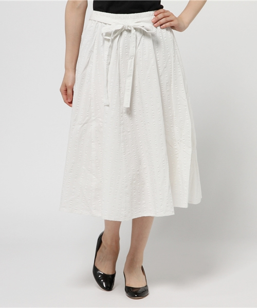 Discoat(ディスコート) 綿麻サッカーで清涼感のあるはき心地を叶えたフレアスカート。台形や三角形のマチを接ぎ合せて作ったゴアードデザインなので、ボリュームたっぷりです。スタイリングを品よく大人顔にまとめるミモレ丈も要注目。ウエストインでディテールを強調しながらトップスをコンパクトにまとめた着こなしがおすすめです。