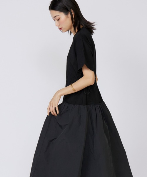 ■デザイン上身頃はしなやかなタッチが特徴の素材のTシャツに、スカート部分はドライタッチな質感の素材をドッキングしたワンピース。ウエスト部分にギャザーを入れたドロスト仕様で、自由にシルエットを変えることのできる遊び心たっぷりのロングワンピースです。上下ともにイージーケア素材で、夏の旅行などでも活躍間違いなしの一枚です。大人の体をきれいに見せてくれるシルエットや、シックな配色にもこだわりました。■素材身頃には、レーヨンの柔らかさにプルンとしたハリ感が加わったしなやかなタッチが特徴の素材を使用しています。ハイゲージの編機を使用し、コンパクトな目面に仕上がっています。スカート部分は、リサイクルナイロンを使用しています。ドライタッチでナチュラルなシワ感と軽さが特徴的な素材です。・裏地なし・ポケットあり・ウエストゴム仕様・水洗い可■サンプル撮影商品■こちらの商品はサンプルでの撮影となっております。実際の商品とは、サイズや色味、素材、デザイン等の仕様が若干変更になる場合がございます。