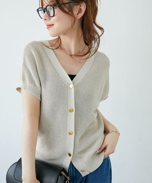 ぺーパーヤーンを使用したシャリ感のある独特な風合いに、表情あるアゼの編地が清涼感漂うニットプルオーバー。カーディガンをベースに前後2wayで着れるデザイン。●ポイント程よいゆとりのシルエットで身体のラインを拾いにくく、ややコンパクトめの着丈で合わせるボトムを選ばないのも嬉しいポイントです。●おすすめコーデゴールドボタンもアクセントになりシンプルなワンツーコーデも華やかに演出してくれ、これからの季節におすすめの一枚です。