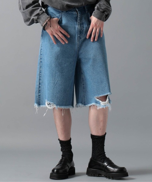 裾にダメージ加工を施したバギーショーツ 12ozのデニム生地を使用している為厚すぎないので夏に最適です。 裾にかけて広がりのあるワイドシルエットで、春夏はもちろん秋冬にはパンツのレイヤードとしても使えるアイテムとなっております。 カラーはカジュアルなコーデにも合うブルーとモードでエッジの効いたスタイルにおすすめのブラックの2色展開です。 パックにはブランドロゴの入ったレザーパッチをあしらっています。 ※撮影環境により、光の当たり具合で色味が違って見える場合があります。あらかじめご了承下さい。