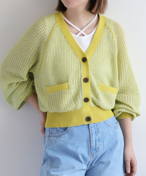 フロント、袖、裾の配色が可愛い透かし編みシアーニットカーデ☺︎ 深めのVネックが女性らしく見せてくれる! ◇Point◇ 目を惹くカラーリングがポイントのサマーニットカーディガン。 身幅はゆったりですが、丈はやや短く、すっきり見え♪袖のワイドスリーブがとても可愛いです。 深めのVネックと大きめのボタンがポイントになってくれます☺︎ 通気性も良く、見た目以上に涼しくお使いいただけます♪ さりげない透け感が、コーディネートに女性らしさをプラスしてくれます☺︎ 薄手になりがちなこれからの時期、体温調節にこれさえあれば◎ しわになりにくいので、カバンの中にもくるくるっと入れておけます! ◇Material◇ ⚫︎フロント、袖、裾の切り替え配色が可愛い!画像で見てくださいね♪ ⚫︎糸もミックスされているので柔らかい印象に☺︎ ⚫︎ポリエステル100%で柔らかくシワになりにくい素材なので着心地抜群! ⚫︎色は夏らしい、オフ、ブラウン、イエローの3色展開☺︎ ⚫︎ぴったりしすぎないゆるっと、フワッと、ふんわりシルエット ⚫︎アクセサリーなどの引っかかりにはお気をつけくださいね ◇Coordinate◇ シンプルなボトムでも配色が映えて、おしゃれ見えする1着。 ワンピースやスカートと合わせてレディーライクコーデにも◎。 着丈がショートなので、ゆったりですが見た目コンパクトに見えます。ワイドパンツで合わせてAラインシルエットもおすすめ。 ロゴT、キャップ、デニム、スニーカーと合わせて甘辛コーデも♪ ※照明や天候により実際の色味と異なって見える場合がございます。ご了承くださいませ。 【キーワード】 #Y2K#20代#30代#40代#50代#大人可愛い#着回し#透け感#イージーケア