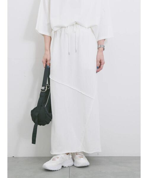 アシンメトリーな切替が個性をプラスするスカート。 タイトなナローシルエットが、すらりと脚長な美スタイルを演出してくれます。 ウエストはゴム仕様になっており、ドロスト紐でサイズ調整も可能。 裏毛素材の肌触りの良さで、デイリーの愛用率も高まりそうなアイテムです。 ※商品画像は、撮影環境やお客様のご利用のPC・スマートフォンのモニター環境などにより実物と色味に差異がある場合がございます。 【その他採寸】 F ウエスト:[ゴム仕様]66cm