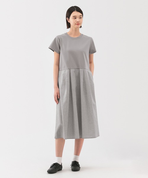 さらりとした肌あたりが特長の、涼感素材を使いました。綿はオーガニックコットンです。【素材】トップス部分には涼しく着られるTシャツ素材を使用し、スカート部分には強撚の撚りを変えて凹凸感を出したシアサッカー素材を採用しています。肌離れが良く、涼しさを感じられる素材で、快適な着心地に仕上がっています。【デザイン】カットソー素材と布帛素材を組み合わせたワンピースです。トップス部分はコンパクトに仕立て、スカート部分はフレア感を持たせたデザインに仕立てています。すっきりとしたデザインながら、女性らしいシルエットに仕上がっています。後ろウエストはゴム仕様で、程よいフィット感で着こなせます。【仕様】透け感:ややあり 伸縮性:なしフィット感:普通 ※生地の若干の透け感があるため、ペチコートの着用をおすすめしますお取扱い上のご注意:●濃色製品は使用中の摩擦や濡れた状態での接触により色移りする事があります。洗濯の際は他のものと分けて洗ってください。お洗濯上のご注意:●淡色製品には蛍光増白剤入り洗剤を使用しないでください。お洗濯上のご注意2:●洗濯ネットをご使用ください。