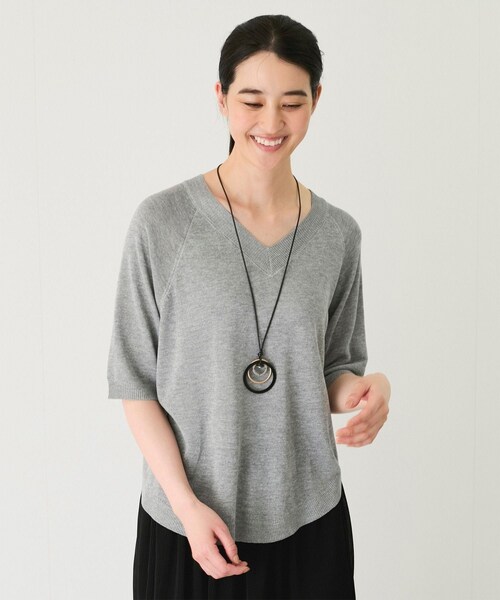 【デザイン・シルエット】 シンプルながらも美しいシルエットを描くVネックのサマーニット。 ほどよく開いたネックラインがデコルテを美しく見せ、女性らしさを引き立てます。 ドロップショルダーとゆったりとした身幅でリラックス感もありながら、キレイ見えが叶う万能トップス。 後ろが少し長めの丈感で、気になる腰回りもさりげなくカバー。カラー展開も豊富で、色違いで揃えたくなる一枚です。 【素材感】 さらっとしたサマーニット素材 【カラー】 07グレー 27ベージュ 32グリーン 40コン 44ブルー 63ピンク 80イエロー 【スタイリングポイント】 長めの丈感なので細身のボトムに合わせていただくのがおすすめ。 デニム合わせはナチュラルな着こなしが叶います。 無地のボトムはこなれ感のある着こなしに、柄物のボトムを合わせて華やかなスタイリングもおすすめ◎ デコルテが開くのでネックレスとも相性抜群◎帽子などの小物合わせもお楽しみいただけます。 コーデの幅がグッと広がりこの夏重宝すること間違いなしです。 裏地:なし 光沢感:なし 透け感:あり ポケット:なし 伸縮性:あり 生地の厚さ:薄手 ボタン:なし その他仕様:なし 季節:春夏 ※撮影時の光、お使いのモニター環境によって色の見え方が違う場合がございます。予めご了承ください。 モデル身長:170cm 着用サイズ:F