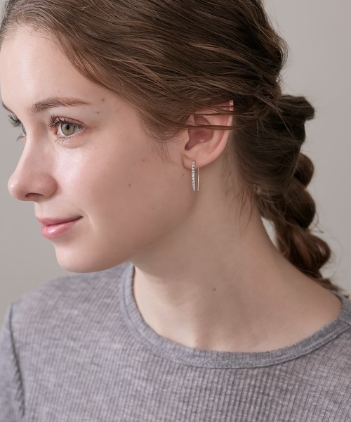 正面にデザインが施されたフックピアス。 シンプルながらも一癖あるデザインは顔周りにさり気ないアクセントを添えます。 イヤーカフとコーディネートするのもおすすめ。 ※手造り線加工の為、形状に個体差があります。 ※シリコンキャッチ付き。
