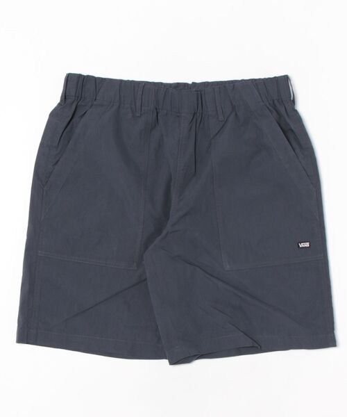 薄手で針のあるコットン x ナイロン素材のファティーグショーツ。 フロント、バック共にパッチポケット仕様。バックポケットにはボタンで開閉するフラップが付属します。 後ろのポケットの補強に裏側に太めのヘリボーンテープを縫い付けてあり、デザインのアクセントにもなっています。 左前ポケットにVANSミニロゴ刺繍、右後ろポケットにネームタグを縫い付けてあります。 ウエストはゴム入り+スピンドルのイージー仕様ながら、ベルトでも着用可能なベルトループも装備。 ※ショーツにはフロントファスナーはありません。 同素材、同デザインのロングパンツもあります。