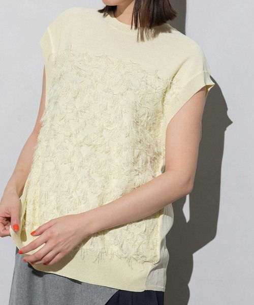 ■2025 SPRING SUMMER collection■ ジャガードのフリンジが今年らしいフリンジニット 抜け感をつくりだすゆとりあるサイジング 前身頃は、ジグザグのジャガード編みの上下2配色仕様で、それぞれ端始末を糸フリンジにしているデザインのニットベスト。 後身頃は、同糸を甘く天竺編みにして、シアー感のあるデザインにギャザーをいれ裾に向けてフレアが広がるAラインシルエットになります。 ロンTやTシャツと合わせて、ベストとして着用したり、1枚で着用したりロングシーズン使えるアイテムです。 【DESIGN】 ■1枚でも着やすい開きの少ないクリブ編みクルーネック ■肩より少しドロップするスリーブ ■後下がりの長めの着丈 ■トライバル柄なフリンジジャガードが、夏らしい印象 【MATERIAL】 微光沢のレーヨンナイロン混合糸を12G、2本取りで甘めに天竺編みで編立てています ・強撚糸の為、甘めに編んでも、ダラっとせずに、しっかりした編地に仕上がり伝線しにくい ・シャリっとしたドライ感が涼し気で春夏ニットに適した糸 夏ニットに適した糸 ・トップ糸は、麻のようなナチュラルな印象 -------------------------- 裏地:なし 光沢感:微光沢あり 透け感:あり 伸縮性:あり 生地の厚さ:薄手 ケア方法:ホームクリーニング(手洗い) -------------------------- ◆お取り扱いについては商品についております品質表示にてご確認下さい。 *光のあたり具合いやパソコンなどのモニター環境によって実際の色味と異なって見える場合がございます。予めご了承ください。 *撮影時はサンプルの為、若干のデザイン変更等ある場合がございます。予めご了承ください。 <INFORMATION> ◆商品のお気に入り登録お気に入り登録していただいた商品は、完売商品の再入荷通知やラスト1点の通知、またクーポン発行やタイムセールの通知もお届け!ぜひご登録してください。 ◆ショップ・ブランドのお気に入り登録新商品や再入荷、ショップ・ブランドのお得な情報をいち早お届け!ぜひご登録してください。