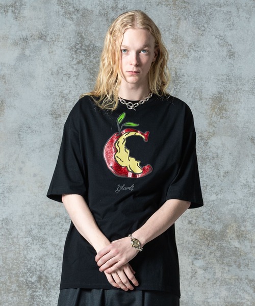 “Hidden Valley”に実るリンゴはいかなる味なのか、ブランドの人気柄である“Eaten Apple”を3Dのアプローチで表現したGlitter Eaten Apple T-shirt。ボディから浮かび上がるような質感を持つモチーフとglambスピンロゴは発泡プリントで立体的にあしらったもの。さらに箔を粒子状に砕いて乗せるグリッタープリントを皮部分に施すことで、思わず手を触れて確かめたくなるヴィジュアルを作り上げました。コットン100%の5.6オンスミディアムウェイト天竺となる生地は柔らかく快適な着用感。サイジングをバランス良く整えたビッグシルエットは柄の存在感をいっそう引き立てます。