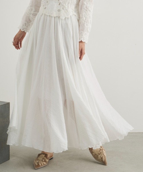 アシンメトリーな裾が軽やかに揺れるシアーロングスカートウエストはゴムの仕様で履き心地を重視しながらも、シルエットではコーディネートの主役になる1枚です。■styling・シンプルなブラウスやカットソーに合わせてシルエットに存在感のあるボリュームギャザースカートは、シンプルなトップスとの合わせでその存在感を発揮します。・ゆったりシルエットのトップスとルーズなコーディネートをトップスにボリュームを持たせても裾のボリュームが負けないよう、さらにたっぷりとしたボリュームに仕上げました。《point》・裏地付きでロングシーズンでスタイリングが楽しめる仕様に・ランダムヘムで表情豊かな動きが魅力・コットンライクの柔らかい素材感が、空気を含んでエレガントな仕上がりに・表地と同じ生地の裏地付きで肌当たりも柔らか《detail》・裾が軽やかに広がるギャザーデザイン・ウエストはゴムの仕様で履き心地抜群《fabric》・表地はコットンライクでナチュラルな風合い・裏地付きなので透けにくい・ご家庭でのお洗濯が可能素材表地:ポリエステル80%,レーヨン20% 裏地:ポリエステル80%,レーヨン20%サイズウエスト:63ccmスカート丈:98.5cmヒップ:98cm……………………透け感 : 無し(ホワイトのみ若干あり)厚さ:普通伸縮性:なし……………………お手入れ方法手洗い 〇お取り扱い上のご注意:お洗濯は手洗いをおすすめします。 タンブラー乾燥は生地の痛みや縮みの原因になりますのでお避け下さい。脱水後はなるべく早く形を整えて影干しをしていただくとご着用時のケアが簡単になります。色移りを防ぐため、単独洗いをおすすめします。-お取り扱い上のご注意:軽く脱水をし、形を整えて平干ししてください。濃色は色移りの可能性があります。濡れた状態での長時間の放置や、淡い色のお洋服とのコーディネートによる摩擦にはご注意ください。色移りを防ぐため、単独洗いをおすすめします。濃色は濡れたままで放置すると色移りの原因になります。お洗濯後はすぐに干してください。-詳しくは付属の「お取り扱い上のご注意」をご確認ください。……………………※ご注意※・屋外の光や照明の当たり具合で、実際の商品の色味とカラー別画像の色味に若干の違いが発生する場合がございます。・詳細画像と併せてご確認の上、ご注文いただきますようお願い致します。【 Libra Cue 】“包み込むような気持ちよさを” 快適で豊かな生活を送りたいそんな暮らしの”きっかけ”となるデイリーウェアをご提案します【 商品のお気に入り登録 】完売カラーの再入荷通知やラスト1点の通知プライスダウンの通知も受け取ることができます。【 ブランドのお気に入り登録 】新商品や再入荷など、ブランドの情報をいち早くお知らせします。※ご注文いただいた予約商品のお届け時期確認は、注文履歴ページより行えます。※他のキャンペーンにより、期間中に価格が変動する場合があります。