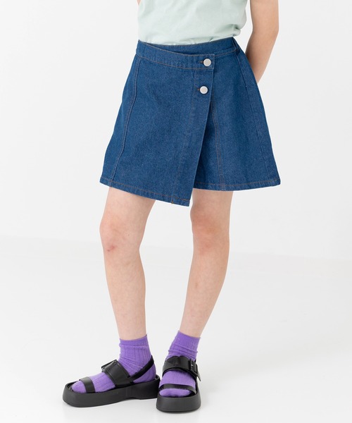 前から見るとラップスカート、後ろから見るとショートパンツに見えるデニムのスカートパンツ! スカートのフェミニンさとショートパンツの動きやすさを兼ね備えた、シーズンを問わない着回し抜群の1枚。 飾りボタンが2つ並んでアクセントに。 後ろはウエストゴムになっているので着脱も楽々◎