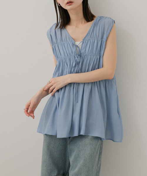一枚で決まる涼やかブラウス 〇立体的なギャザーデザイン 〇Vネックで抜け感 〇接触冷感のある素材で涼しく着用できる styling パンツ合わせでカジュアルながらも女性らしいスタイルがおすすめのブラウス◎ロングスカートと合わせたリゾート感のあるスタイリングや、ショートパンツやハーフパンツと合わせて、夏らしいリラックススタイルも素敵です。 【2025 Spring/Summer】【25SS】 ※この商品は、家庭用洗濯・ドライクリーニング共に多少縮みますのでご了承ください。 ※クリーニング溶剤を汚すおそれがあります。ドライクリーニングされる場合は、単独での洗いを依頼してください。 ※商品画像は、光の当たり具合やパソコンなどの閲覧環境により、実際の色味と異なって見える場合がございます。予めご了承ください。 ※商品の色味の目安は、商品単体の画像をご参照ください。 ▼お気に入り登録のおすすめ▼ お気に入り登録商品は、マイページにて現在の価格情報や在庫状況の確認が可能です。 お買い物リストの管理に是非ご利用下さい。 素材感 透け感 : あり(IVORY), ややあり(L.BLUE) 伸縮性 : なし 裏地 : なし 光沢 : なし ポケット : なし one