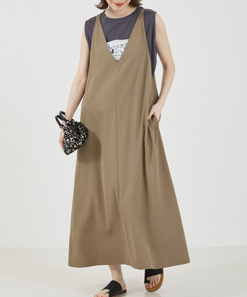 オンオフ使えるキレイ目ワンピ【Design】前後着用可能なキャミソールジャンスカ。深Vネックのすっきりした衿ぐりと、キャミワンピ見えの2パターン楽しめる1枚。タンクですっきり着てももちろんTシャツを合わせて着用することもできます。肩紐側で長さ調節も可能になっています。【Fabric】接触冷感の素材を使用。肌触りもよく落ち感が綺麗なシルエットを出してくれる素材です。暑い時期でもさらっと心地良く着用していただけると思います。【Styling】袖ありのインナーを入れれば長い季節着用できます。夏はノースリやベアなどでヘルシーに着こなすのがおすすめ。ジャケットなど羽織ればキレイ目な着こなしにも◎**********************透け感:なし裏地:なし伸縮性:ややあり光沢感:なし生地の厚さ:普通**********************