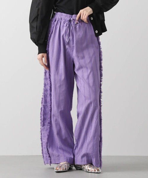 【Le Melange/ル・メランジュ】から、フリンジの素材感が印象的なワイドパンツをセレクト。 脇切り替えパーツは前後にフリンジテープを挟み込み、キャッチーなディティールをプラス。素材はインドならではの打ち込みの甘い柔らかな綿織物を使用。カットドビー組織で、横敵のあるストライプ柄の両端が小さなフリンジのように立体的になっている特徴的な生地です。綿無地の裏地付き。 エアリーな綿素材はとにかく涼しく、夏に重宝すること間違いなし。プリントTeeやシャツと合わせた、ラフなスタイリングがおすすめです。 【Le Melange/ル・メランジュ】 ベーシックなアイテムにメンズライクな要素を取り入れ、フェミニンな雰囲気をプラスしたオーセンティックなトラッドカジュアルブランド 【 お買い物をもっと楽しんでいただく為に 】 ▼商品のお気に入り登録▼ 完売カラーの再入荷や、ラスト1点、セールの通知をお知らせします。 割引クーポンの発行などお得な情報も! ▼ブランドのお気に入り登録▼ 新商品や再入荷など、いち早くグレディブリリアンのお得な情報を受け取ることができます! 【Gready Brilliant】 「ほどよい存在感」を大切にする大人の女性のためのセレクトショップ。
