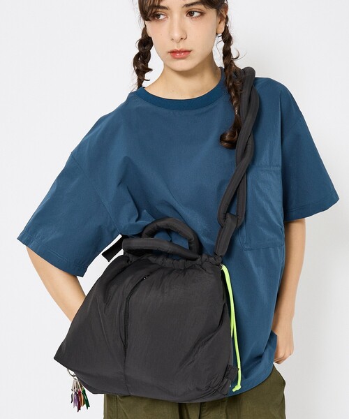 2WAY 仕様の巾着ショルダーバッグ 中綿をいれたふんわり機能的なバッグ。 軽量ながらも丈夫なREPETポリエステル素材で作られており、アクティブに持ち運びに便利です。 口元は巾着仕様になっておりコードで開閉できます。 さっと取り出したい時にすぐ取り出せるのが巾着バッグの便利ポイント。 フロントにあるポケットにはジッパーなどの附属は付いていませんが、フラップが長く仕立てられている為、荷物の飛び出しなどがありません。 マグネットやジッパー開閉などの煩わしさがなく取り出しやすいものを入れるのにとっても便利なポケットです。 ひねりあるショルダーがポイント。 【商品仕様】 <開口部> 巾着 <前面> ポケット×2 【素材・色味について】 ●裁断によって模様の配置が写真と異なる商品がございます。 ●商品画像と実物ではモニター及び画像性能等の関係で多少色味に違いがございますので予めご了承ください。 ●合皮皮革等の生地は経年劣化します。 ●過剰な摩擦、湿った状態でご使用されますと他の衣類への色移り、色落ちする場合があります。 【cheek/チーク】 日常にチークのような鮮やかでポジティブなエネルギーを。 カラーパレットを使ったようなカラフルなデザインで毎日のちょっとした瞬間を特別なものに。 cheek の商品には環境に配慮して作られた素材を使用しております。 ・GRS商品(Global Recycle Standard) 回収された廃棄ペットボトルを再資源化してポリエステル繊維糸として再生させた生地を使用。 新しい資源を使わず今あるものを資源として活用する事が、環境への配慮と海洋プラスチックゴミの削減にもつながります。 ・CPSC規格(消費者製品安全委員会) 安全規格基準をクリアした鉛フリーの合成皮革生地を使用しております。 廃棄などの理由から溶けだした鉛が雨などによって河川や海洋、さらには生態系を汚染するとともに、食物や飲料水として人間に取り込まれ蓄積されていきます。 鉛フリーの商品を使用する事により土壌・海洋汚染や人体・動物への負荷を軽減し、環境や生態系を崩さない様に有害物質問題への取り組みをしています。 リサイクル生地や安全基準をクリアした素材を使用し、持続可能な明るく優しい未来の為の物作りを目指していきます。