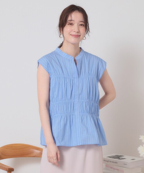【デザイン】 ビスチェ風のシャーリングデザインがトレンドライクな一着。 クリーンなムードのストライプ柄が夏のコーディネートにピッタリのブラウス。 トレンドのビスチェ風シャーリングデザインはシルエットにメリハリをつくり、自然なスタイルアップが期待できるアイテム。 スキッパータイプの衿開きは顔周りをすっきり見せてくれます。 薄手でさらりとした生地を使用しており、軽い着心地なのも魅力です。 【素材】 さらりとしたタッチ感の薄手の先染めストライプ生地。 ※照明の関係により、実際よりも色味が違って見える場合があります。また、パソコン・スマートフォンなどの環境により、若干製品と画像のカラーが異なる場合もございます。 モデル情報:身長166cm B80 W59 H85 着用サイズ:00(フリーサイズ) 店舗へのお問い合わせ商品番号:P93-52527 ●製品寸法: 00(フリーサイズ):着丈59cm B84cm 裄丈23cm 備考: