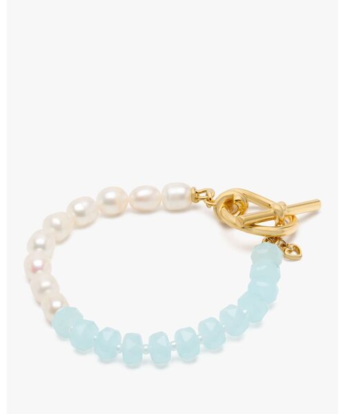 スタイリングをまとめる、仕上げ役として手元に添えたいタイムレスなトグル ブレスレット。艶めく淡水パールとガラスビーズを合わせたコントラストが視線を捉えます。 【商品詳細】 ・重さ:18.83g ・留め具:トグルリング & バー