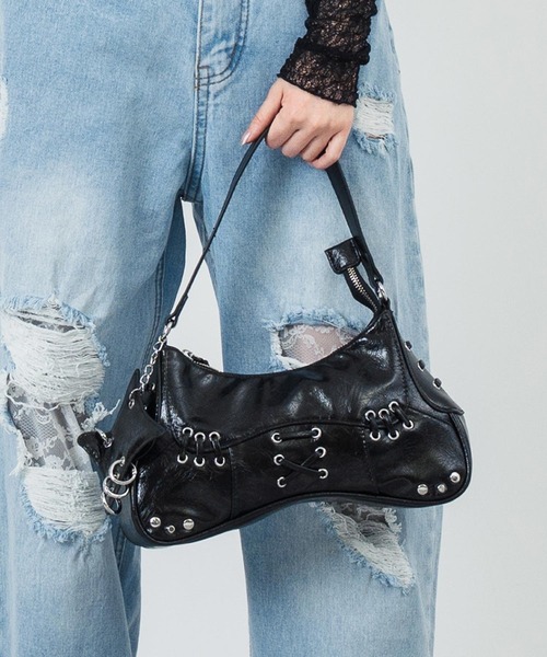 ひとクセが、大人の余裕。個性が光る黒バッグで差をつける。●いつものスタイルに、ピリッと効かせるアクセントが欲しいときに。 ●ハトメ&編み上げデザインが、大人の遊び心を演出してくれる。 ●持つだけで、こなれたエッジィスタイルが完成する、頼れる存在感。 ♦detail スタッズ風のハトメと編み上げが印象的なデザイン。 程よくハードなディテールながら、艶感のある素材で上品さをプラス。 肩掛けもできるちょうどいいサイズ感&軽さで、デイリー使いにもぴったりです。 ♦styling ○モード系→ブラックワンピやワイドパンツと合わせて、全身を引き締める辛口モードコーデに。アクセ代わりのバッグとして活躍。 ○カジュアルだけど“手抜きに見せない”コーデ→デニム+白シャツなどのベーシックスタイルにプラスして、シンプルコーデにスパイスを。程よくトレンド感のある雰囲気に。 ○大人フェミニン系→レースやフレアスカートと合わせて甘辛MIXに。女性らしさの中に強さを感じさせる、今っぽいコーデが完成。 ♦コーデにおススメ レースリボン ピグメント Tシャツ(153-5736) リブニット ホックデザイン カーディガン(154-5687) ----------------------------------------- 光沢感・・・あり ポケット・・・外側(ファスナーポケット×1) 内側(ファスナーポケット×1) ----------------------------------------- <サイズ> タテ:15cm ヨコ:(上)21cm(下)29cm マチ:7cm 持ち手:43㎝ ショルダーベルト:109cm~119cm(取り外した状態で) ※付属ショルダーベルト5段階調節可/取り外し可能 ※密着させておきますと移染しますのでお取り扱いにはお気を付けください。 ※モデル着用画像は光の当たり具合で色味が違って見える場合がございます。 ※商品の色味の目安は、商品単体の画像をご参照ください。 【お買いものをお楽しみいただく為に!】 ▼商品のお気に入り登録 完売カラーの再入荷通知や、ラスト1点の通知、セールの通知も受け取ることができます。 ▼ブランドのお気に入り登録 新商品や再入荷など、いち早くブランドのお得な情報を受け取ることができます。