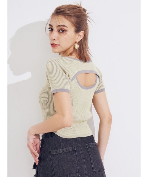 バイカラーのプレーティングのリブの編地が目を引く1枚です。 背中開きのデザインとなっておりヘルシーな肌見せができる1枚。 胸元に入ったワンポイント刺繍もデザインのアクセントになっています。
