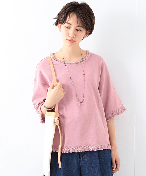 袖・首元にフリンジをあしらったTシャツ。肌触りの良いコットン素材を使用し、着心地抜群のひと品です。ドロップショルダーで、ややゆったりしたデザインが、女性らしい印象に。ボトムにはシンプルにデニムを合わせて、大人のカジュアルスタイルをお楽しみ下さい♪ 店舗へお問い合わせの際は下記品番をお伝えください。 品番:63-04-0141-152