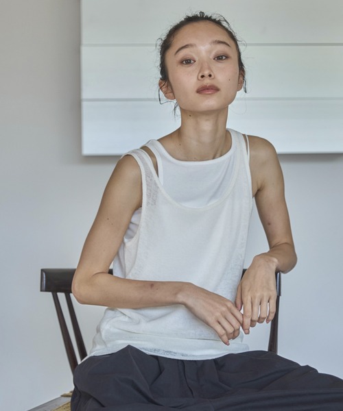 ◆Detail素材の違う2種類のタンクトップがドッキングされたデザイントップス。上がニットソー、下がリブ生地になっており、左側の肩部分のみ縫製されているので右肩部分は少しずらしてアシンメトリー風にご着用もいただけます。同系色で揃えたニュアンスカラーがお洒落な印象◎一枚でレイヤードスタイルが完成するため簡単に今っぽいスタイリングが完成します。サロペットなどのインナー使いにもおすすめな一着です。◆Fabric-----------------------------------------------透け感:なし(アイボリーややあり)伸縮性:あり光沢:なし生地の厚さ:★★★☆☆----------------------------------------------※汗や水、摩擦により他のものに色移りすることがありますのでご注意ください。※濃色製品は色移りすることがありますので、他の物と分けて洗濯してください。※生産時期によりサイズや質感・色味に若干の個体差がみられる場合がございます。※商品画像は、光の当たり具合やパソコンなどの閲覧環境により、実際の色味と異なって見える場合がございます。予めご了承ください。※着用、お取り扱いの際は、商品についている品質表示とアテンションタグを必ずご確認ください。◆Information欲しいitemをお気に入り登録(♡マークをclick) ・お買いのがし対策…完売itemの再入荷やラスト1点の情報をお知らせ ・欲しいitemをお得にget…pricedownになったらいち早くお知らせ ・スムーズ検索…ZOZOのお気に入りアイテムページで簡単checkできるから、再検索不要♪