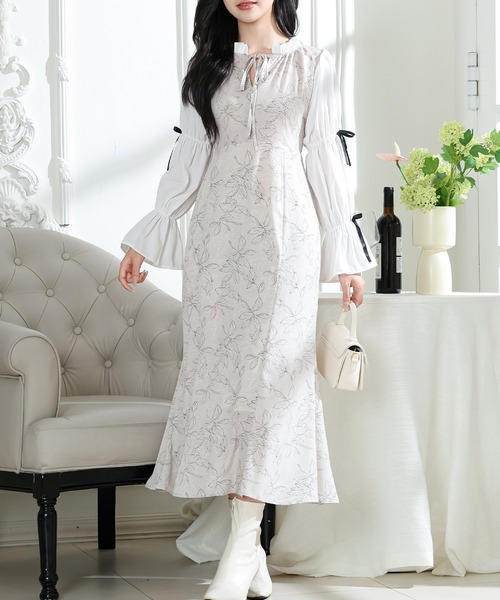 ブラウスとワンピースがドッキングした1枚で着映えするワンピース。 リボンをあしらったキャンディースリーブが大人の可愛さを引き立てます。 上品なフラワープリントと組み合わせることで甘さを抑えており、裾に向かう緩やかなフレアシルエットも大人フェミニン。 バックウエストはシャーリングを採用してフィットさせつつも、ラクな着心地を叶えました。 パンプスやショートブーツを合わせるのはもちろん、あえてスニーカーでカジュアルダウンした着こなしもおすすめです。 ■商品詳細 ・透け感:なし ・裏地:あり ・バックウエストゴム <注意点> ・色合いはモニター環境により若干の誤差が出ます。 ・サイズは平置きにして測定していますが、測り方によって誤差が出る場合がございます。 ・入荷・生産時期により、色、サイズ、素材など多少異なる場合がございます。 ・本製品は生産過程におきまして、生地を織る際の糸の継ぎ目や多少のほつれが生じることがあります。 ・簡易包装となっており、保管・梱包時にシワが伴う場合がございます。