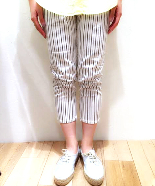 ◇足をきれいに見せてくれるテーパードラインがきれいなストライプパンツ 足先に細くなるテーパードラインと半端な丈感がキレイなストライプパンツ ニットやシャツで合わせればきれい目に、Tシャツならカジュアルに、合わせ方で雰囲気の変わる便利な1本です。 ホワイトとネイビーの2色展開なので着回しもしやすいのも特徴です。