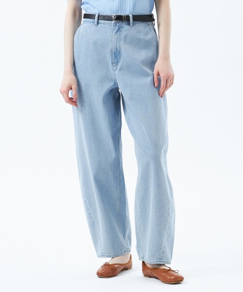 <構築的なカーブデザインデニム>一着でスタイリングにトレンド感をプラスしてくれる、カーブデニム。膝に向けてボリュームを出して裾で絞ることでコントラストのあるシルエットにしています。脇線を前に振ることで、視覚的なアクセントに。トレンドのショート丈トップスとのスタイリングもおすすめです。【素材】糸に膨らみがある空紡糸を使用しており、洗い加工で立体感が出ます。太めの糸のヴィンテージ感のある表情も特徴です。おすすめ着用期間:春/夏/秋/冬※34サイズはオンラインストア、ジェイアール名古屋タカシマヤ店、山形屋店のみでのお取扱いになります。※この商品はサンプルでの撮影を行っています。実際の商品とイメージ、仕様が異なる場合がございます。