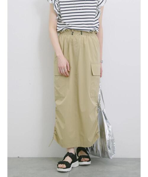 ウエストと裾のドローコードがポイントになったナイロンカーゴスカート。 カジュアルさもありつつ、タイトなIラインシルエットでスマートにスタイリングすることができます。 ゴム仕様で安心感のあるはき心地なのも魅力ポイント。 デイリーユースにも重宝しそうなアイテムです。 ※商品画像は、撮影環境やお客様のご利用のPC・スマートフォンのモニター環境などにより実物と色味に差異がある場合がございます。 【その他採寸】 F ウエスト:[ゴム仕様]66cm