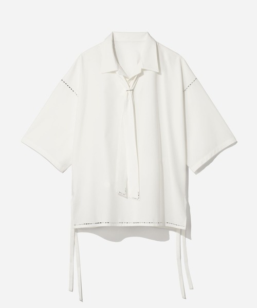 ーーー セットアップ対応 シルバーパーツをあしらったボウタイがポイントのスキッパーシャツ ーーー point □裾口やボウタイの剣先などに細かいシルバーパーツをあしらったデザイン。 □前立てにDカンを付けることでボウタイを通したときにさりげないアクセントに。 □ボウタイ部分は取り外し可能な仕様で汎用性も〇 □ホワイト,ブラック,パープルは無地、グレー系その他は総柄のアソート展開。 □サイドに紐を付けた動きの出るデザインで、一枚で様になります。 □スキッパー襟で首元に緩さを出し、オーバーサイズなのでラフに着用できます。 □適度なハリ感と落ち感を兼ね備えたポリエステル生地でお手入れもしやすい。 □同素材のボトムスとセットアップで着用可能。 set item セットアップ対応アイテムはコチラ→【327270】