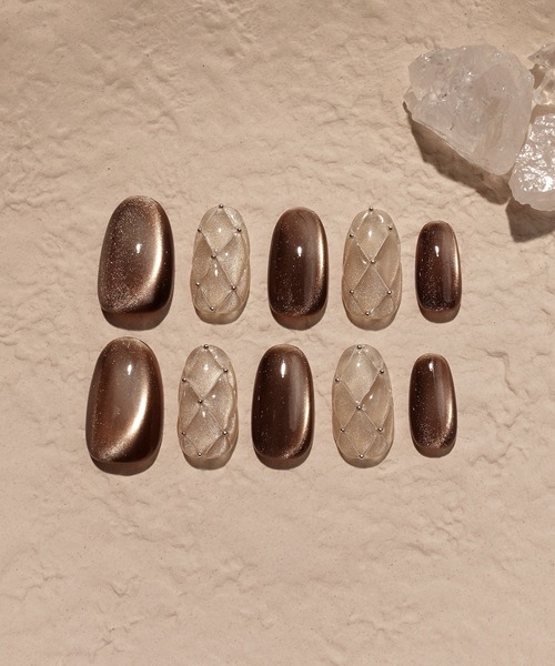 90%の方はMサイズをご購入 チップをお湯で温めるとカーブを調整可能 CodingSet(ベース・ジェル)+専用ライト+リムーバーオイルのЗ点セットで最大30日間持続できるネイルセットが完成! ブラウンのマグネットネイル×ベージュのキルティングデザインがシンプルで大人可愛いネイルチップ ブラウンのマグネットネイルとベージュのキルティングデザインを組み合わせた、大人可愛いネイルチップです。 ブラウンの輝きが指先を上品に彩り、キルティングのアクセントがシンプルながらも華やかな印象を与えます。 落ち着いたデザインなので、オフィスネイルとしても使いやすく、どんなシーンにも馴染む万能アイテムです。 特別な日だけでなく普段使いにも。 トレンド感と上品さを両立したネイルチップで、ワンランク上の指先を演出します。 形:オーバル(角がない丸いタイプ) ポイント:シンプル,キルティング,マグネット,ワンカラー,スタッズ,オーバル,オフィス,ベージュ系,ブラウン系 結婚式や同窓会などのお呼ばれ、大切なデートの予定などで「その日だけネイルをしたい」という普段ジェルネイルが出来ない方や、セルフネイルを楽しみたい方へネイルチップをご用意いたしました。 気軽に使えて、アクセサリーのようにその日の気分によってお選びいただけます。 ジュエリーのような輝きのラグジュアリー感あるネイルチップを是非お試しください。 MODEL 着用サイズ : M サイズ:S 親指:13mm 人差し指 :9mm 中指 :10mm 薬指:9mm 小指:8mm ---------------------------------- サイズ:M 親指:14mm 人差し指 :10mm 中指 :11mm 薬指:10mm 小指:9mm ---------------------------------- サイズ:L 親指:15mm 人差し指 :11mm 中指 :12mm 薬指:11mm 小指:10mm ※記載サイズは自爪の1番広い部分の横幅です。 ※付属のネイルファイルで削るとサイズや形の調整が可能です。 ※サイズ表記について商品によって同サイズや同色等であっても各商品毎に誤差がある為、サイズ表記はあくまでも目安としてご参照ください。 <使用方法> 1. ネイルファイルで自爪の表面や形を整えます。 2. 手を洗い、水分をしっかり拭き取ってください。 その後、付属のアルコールパットで爪の表面を拭きましょう。 3. 自爪のサイズと合うチップを根元に合わせて装着します。 このとき、根元から空気を抜くように貼り付けるとしっかり装着できます。 4. 30秒ほど上から抑えたら完成です。 【ご注文の際のご注意】 照明やモニターの写り具合により、画像と実際の商品の色が多少違って見える場合がございます。 爪に異常のある方、アレルギー体質の方、爪の薄い方、弱い方は使用しないでください。 爪に異常を感じた場合は直ちに使用を中止し、専門医等にご相談ください。 以上、ご了承の上ご購入をお願い致します。 Recommend scene 結婚式、二次会、パーティー、デート、オフィス、フォーマル、披露宴、お呼ばれ、成人式、同窓会、女子会、二次会、忘年会、新年会、謝恩会、演奏会、発表会などのシーンでご利用いただけます。 ▼商品のお気に入り登録 完売カラーの再入荷通知や、ラスト1点、セールの通知をお知らせ致します。 ▼ブランドのお気に入り登録 新商品や再入荷など、いち早くブランドの情報を受け取ることができます。 是非ご利用頂き、お買い物をお楽しみ下さい。 ※ご注文いただいた予約商品のお届け時期の確認は、注文履歴ページより行えます。 ※工場の生産の都合上、納期が変更になる場合がございます。発送日の前後については予めご了承ください。 ※実際の着用感には個人差がございますので、予めご了承いただけますようお願い申し上げます。